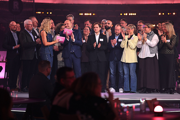 Kenneth Sørensen var på scenen i showet og sammen med lokale virksomheder, der har støttet den gode sag som en del af Næstved Puljen, offentliggjorde han den gode nyhed med beløbets størrelse. Pressefoto: Danmarks Indsamling.