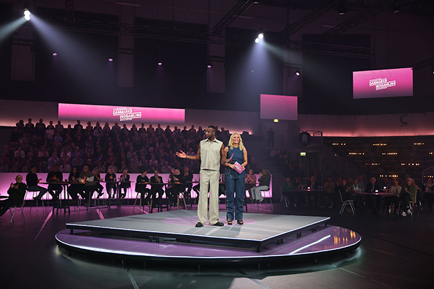 - Lørdag i Arena Næstved var det 20. gang, at Danmarks Indsamling løb over skærmen, og i år blev det store show styret af værterne Josefine Høgh og JJ Paulo. Dette års show samlede over 100 millioner kroner ind til børn i verdens glemte kriser. Pessefoto: Danmarks Indsamling.